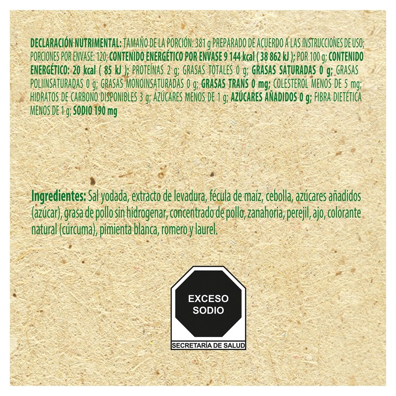 - Caldo de pollo de fácil disolución, sin colorantes artificiales ni conservadores*
