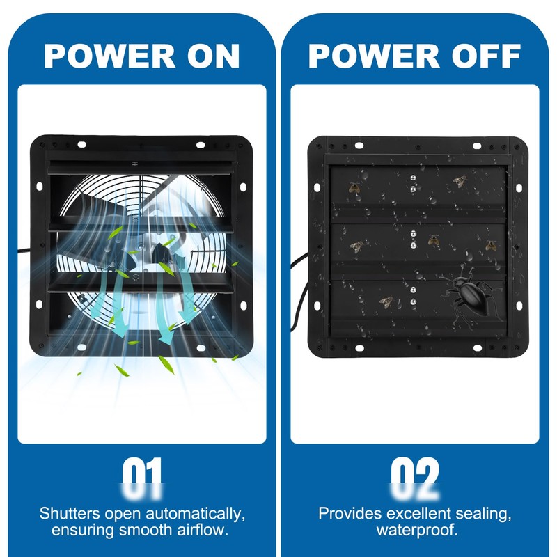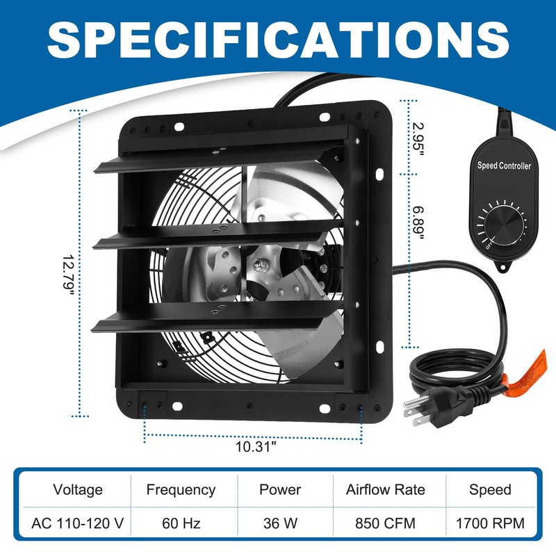 - High-Performance Airflow–Shutter Exhaust Fan delivers powerful 850CFM ventilation to quickly remove heat, humidity, odors, and dust, creating a cooler and fresher environment in any space