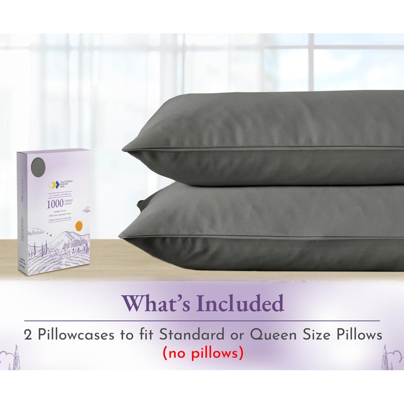 California Design Den 1000 Thread Count, Soft & Smooth, 100% Cotton Sateen Weave, Hotel-Quality, Set of 2 Classic Style Grey Pillow Case Queen Size Fits Std & Queen Size Pillows