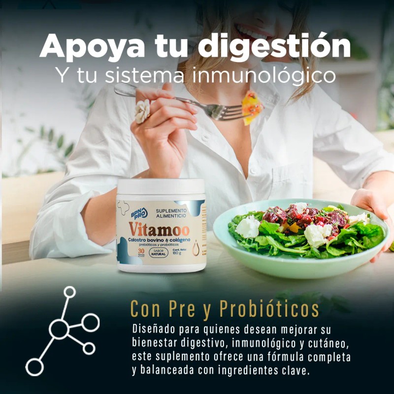 Calostro Vitamoo BPN PRO Natural con Colágeno, Probióticos y Prebióticos. Refuerza tu sistema inmune, mejora tu digestión y apoya la regeneración celular con ingredientes de máxima calidad.