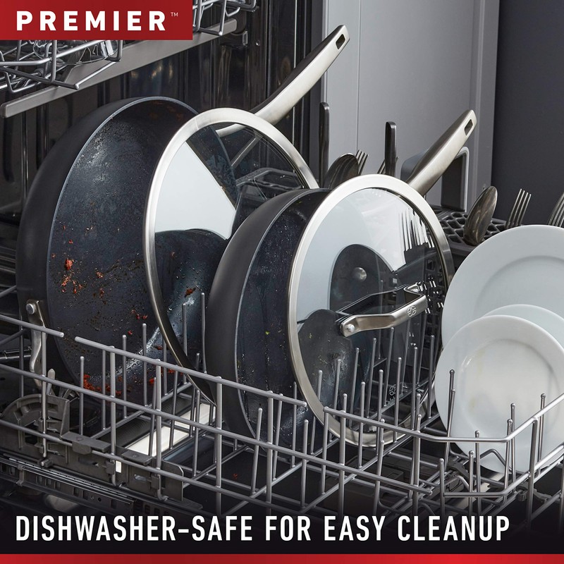 - Metal-utensil safe, with a durable, 3-layer, hard-anodized aluminum interior