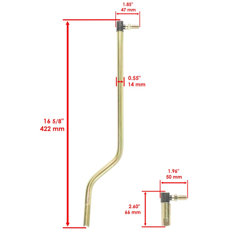 - Product Dimentions: Right/Left Side Drag Link: Length: 422 mm | 16.62" Diameter: 14 mm | 055" TieRod End: Length: 66 mm | 2.60" Width: 50 mm | 1.96