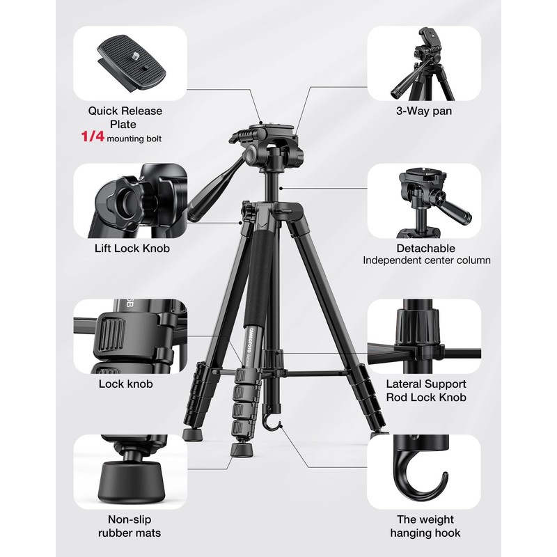 - UNIVERSAL TRIPOD FOR CAMERAS, PROJECTORS, AND TELESCOPESThe tripod and monopod quick-release plates feature 1/4" mounting bolts, compatible with any device that has a 1/4" screw hole, such as cameras, ring lights, projectors, and smartphones. A center column hook allows counterweights for added stability against minor impacts, ensuring excellent support for these devices(keyword: projector tripod/telescope tripod/webcam tripod/laser level tripod).