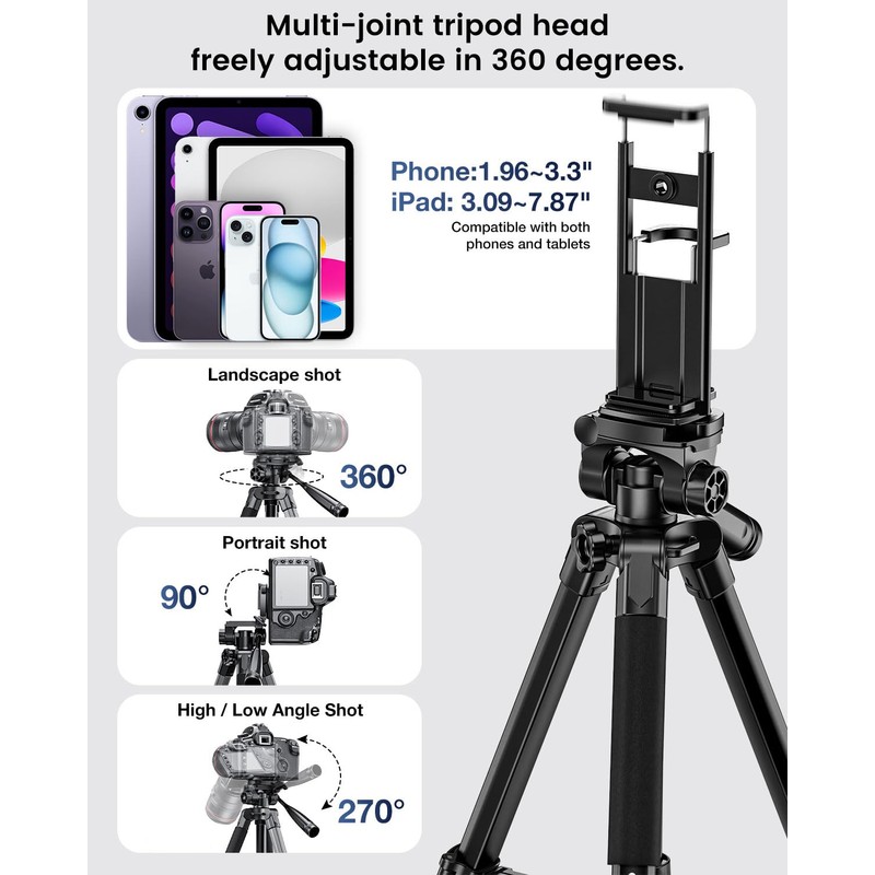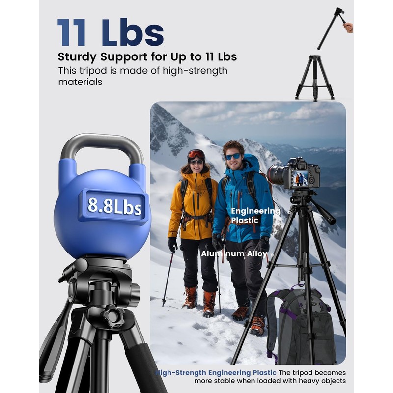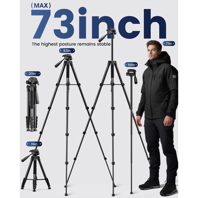 - STURDY AND STABLE, YET LIGHTWEIGHTThis lightweight DSLR camera tripod has a built-in monopod for enhanced stability. The maximum height is 73.3 inches (for cameras) and 75 inches (for smartphones), with a minimum height of 21 inches. The bubble level ensures precise alignment. It is ideal for DSLR cameras (up to 11 lbs), mirrorless cameras, CSC, and action cameras, but not suitable for telephoto lenses.