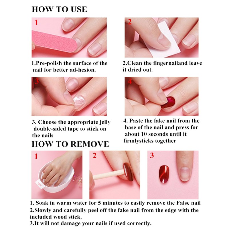 - CAMILCY Handmade Fake Nails Use and disassembly Deluxe salon hand-painted false nails are suitable for glue paste jelly double-sided adhesive paste and GelUV Finished paste Only simple steps are needed to complete the salon like gel artificial nails in a few minutes To wear and remove the jelly double-sided tape simply use a small wooden stick to gently lift it away from the edge of the nail For more wearing and removal methods please refer to the product image