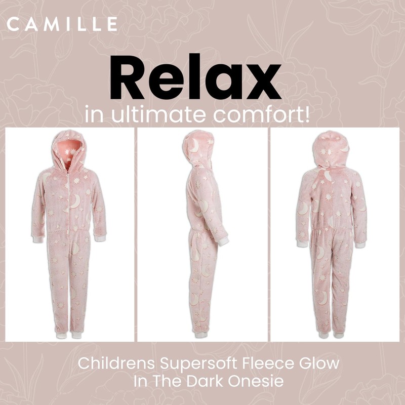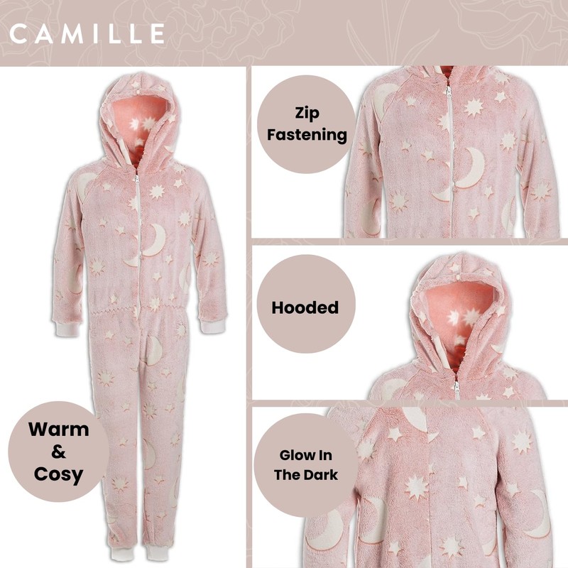 Camille Childrens Super Soft Fleece Onesie - Glow In The Dark Hooded All In One - Long Sleeved and Full Length with Elasticated Cuffs and Ankles Pink 12-14 Years