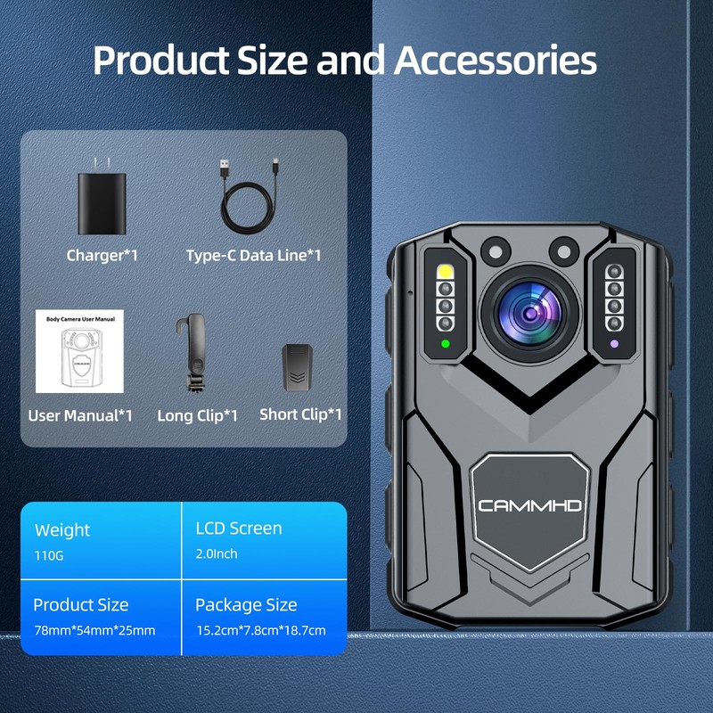 - QHD 1440P Body Cam & Portable Body Camera for Law Enforcement: The Z5 body cam with audio and video has a QHD 1440P video resolution and a wide angle of 130°, so users can take clear and wide shots. At the same time, the body cam is smaller and lighter, measures 78mm x 54mm x 25mm and weighs 110g. It is very suitable for police officers, security forces or other people who wear it on the body to record high-resolution scenes.
