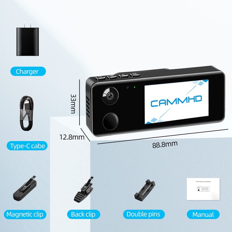 - 【CAMMHD Package 】Includes 1*W1 Body Camera, 1*32GB SD Card(in camera), 1* USB-C Charging Cable, 1*Pin clip, 1*Metal Clip, 1*Magnetic Clip, 1*User Manual. The body size is about 8.8mmx33mmx12.8mm, and the weight is only 50 grams