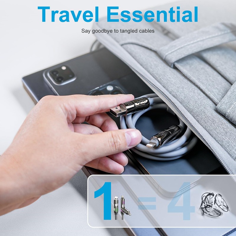 • Note: USB C Cable cannot be used with thick phone cases 4 in 1 charging cable for all devices This 4-in-1 USB-C fast charging data cable supports fast charging and data transfer, and is compatible with iPhone, iPad, Samsung Galaxy, MacBook and other devices. 4in1 charging cable has four connectors: USB-C to USB-C, USB-C to lightning cable, USB-A to USB-C, and USB-A to lightning cable, simplifying your charging and synchronization experience. The thickened gold-plated copper core improves stability and speed, supports 240W fast charging, and no longer worries about carrying multiple cables when traveling or on business trips.