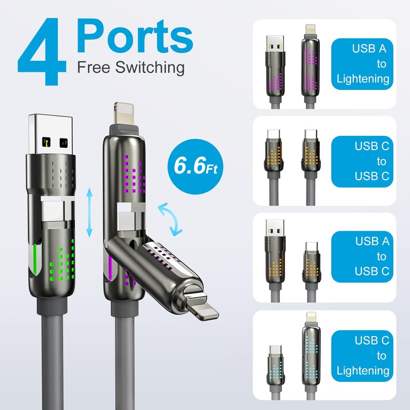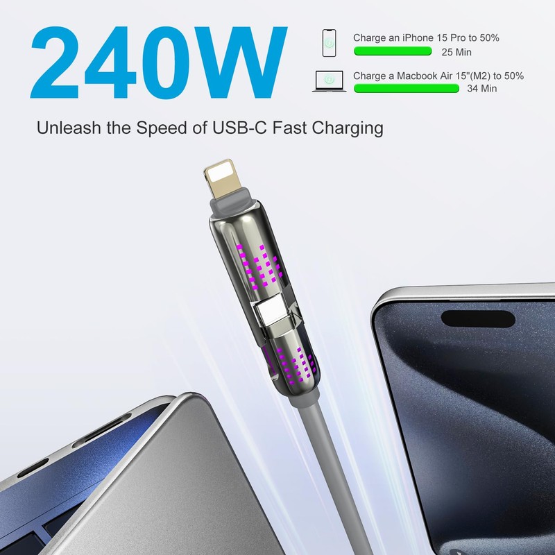 CAMPEXON CAMPEXON 4 in 1 Charging Cable (6.6FT), 240W Chubby Cable Multi USB C Charging Lightning Cable with Light, USB A/C to C/Lightning Cable for Multiple Devices, iPhone 16 15 14/MacBook/iPad Pro, Grey
