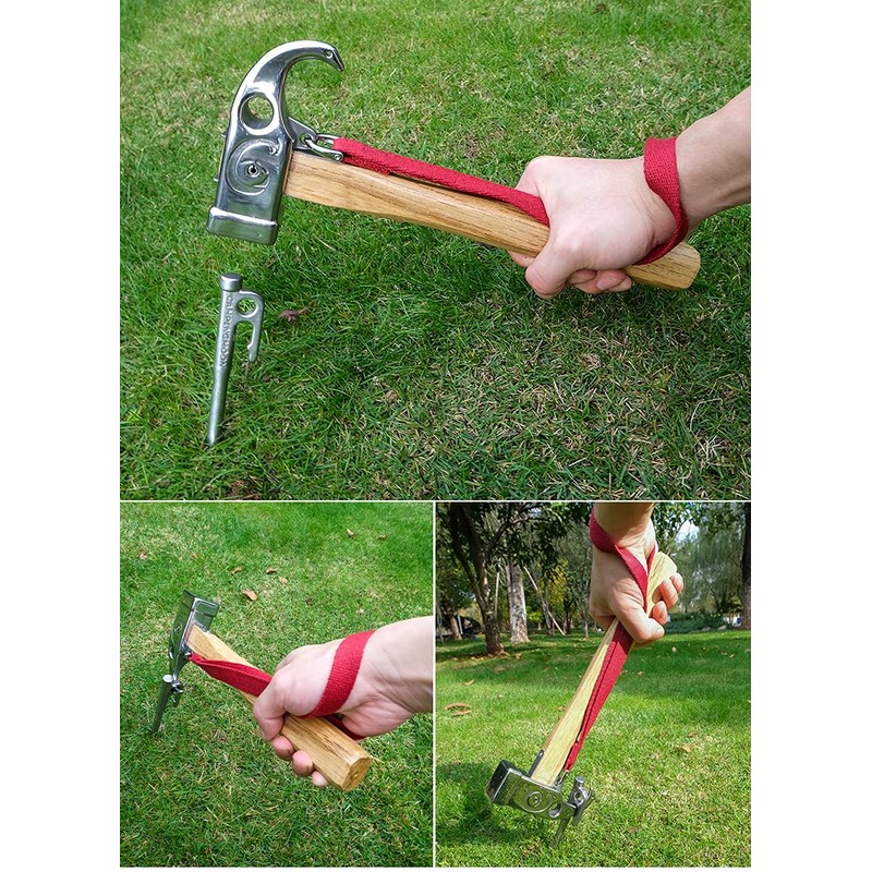 • This camping hammer can be used when pulling out the peg with the hole and hook at the rear.