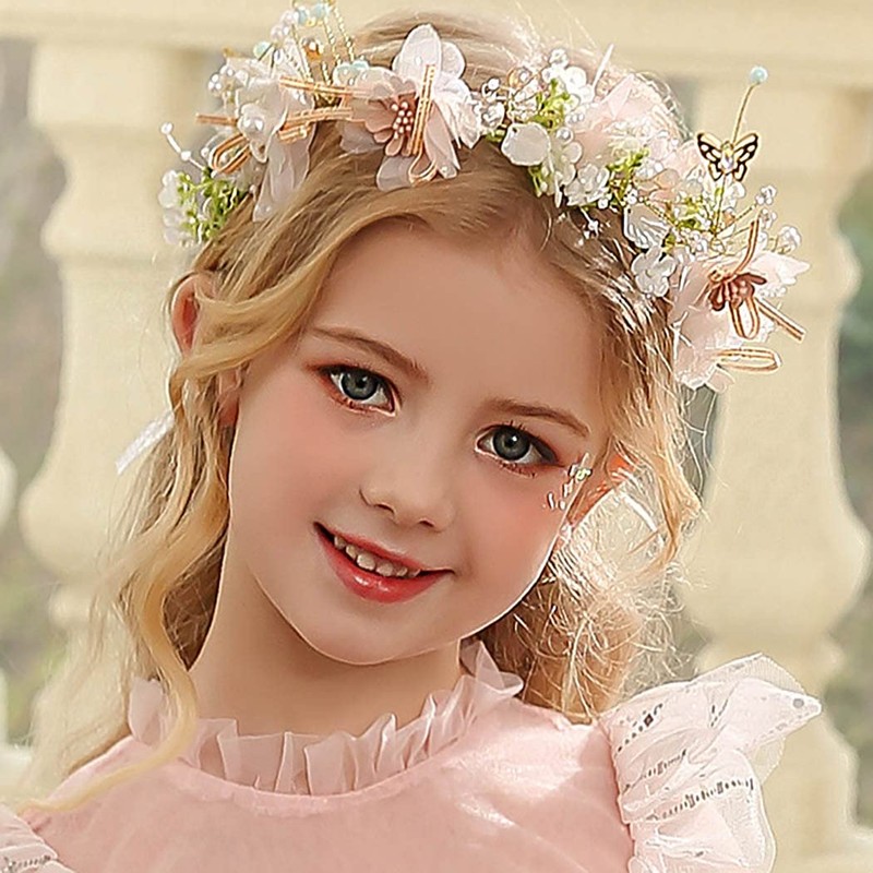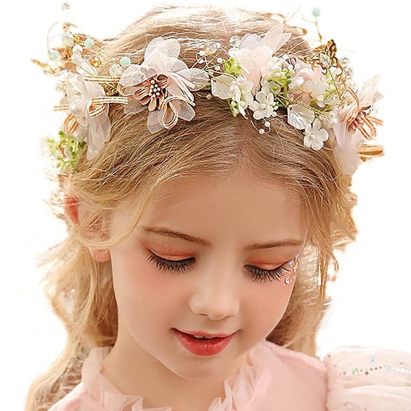 Campsis Princess Flower Girl Headpiece Pink Floral Crystal Headband Handmade Tulle Butterfly Pearl Hair Accessories Communion Birthday Wedding Prom Photography for Girls and Women, 7, Crystal, pearl
