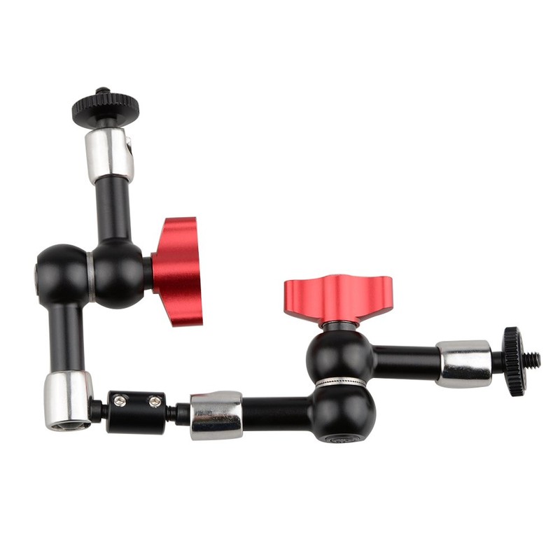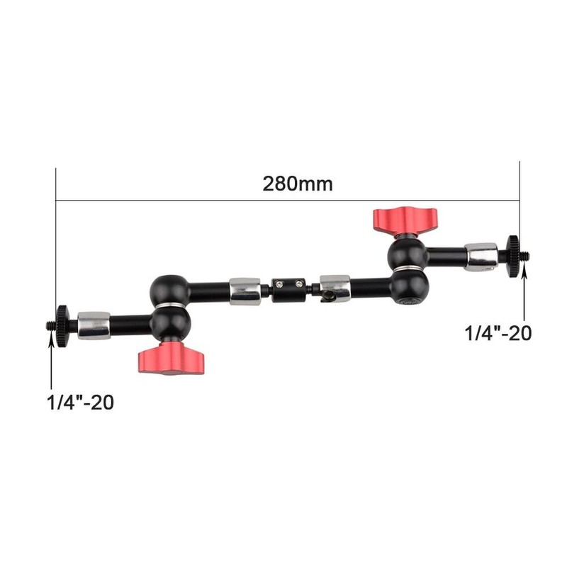 The Max extension of this magic arm is 28cm,have five section that can be bend,you can use this extension arm to hole monitor,video light or DV,have 14"-20 thread at both end,is very useful in daily use.