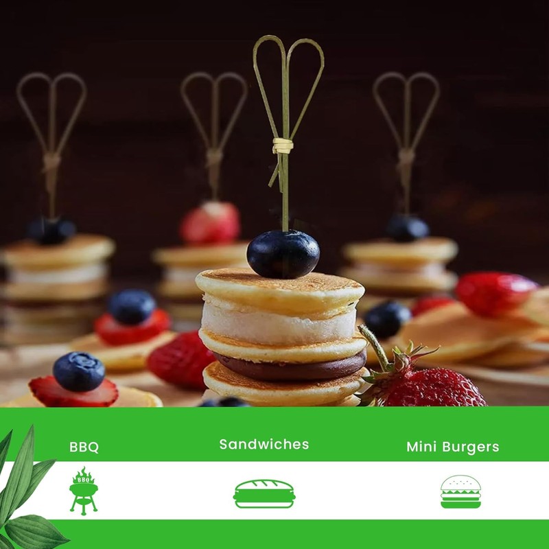 - Heart-Shaped Skewers: Elevate your gatherings with our exquisitely crafted heart-shaped bamboo skewers, perfect for adding a touch of elegance to any dish and enhancing the overall presentation at any event.