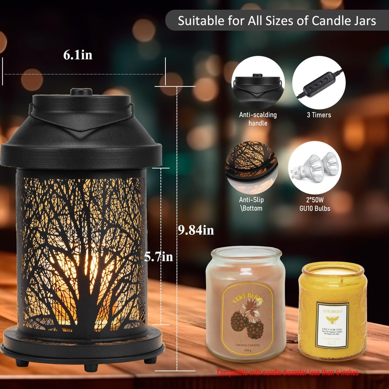 - Perfect Decor and Gift: This candle warmer lamp is made of metal throughout, looks delicate and unique; The forest pattern on the lamp cover adds a mysterious feeling when the device is light up, which is both functional and decorative, very suitable for various space such as family living rooms, bedrooms, study rooms, offices, yoga studios, etc.; This candle warmer lamp also will be the best presents for your important people on holidays such as Thanksgiving, Christmas day, or New Year's Day.
