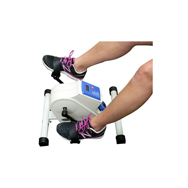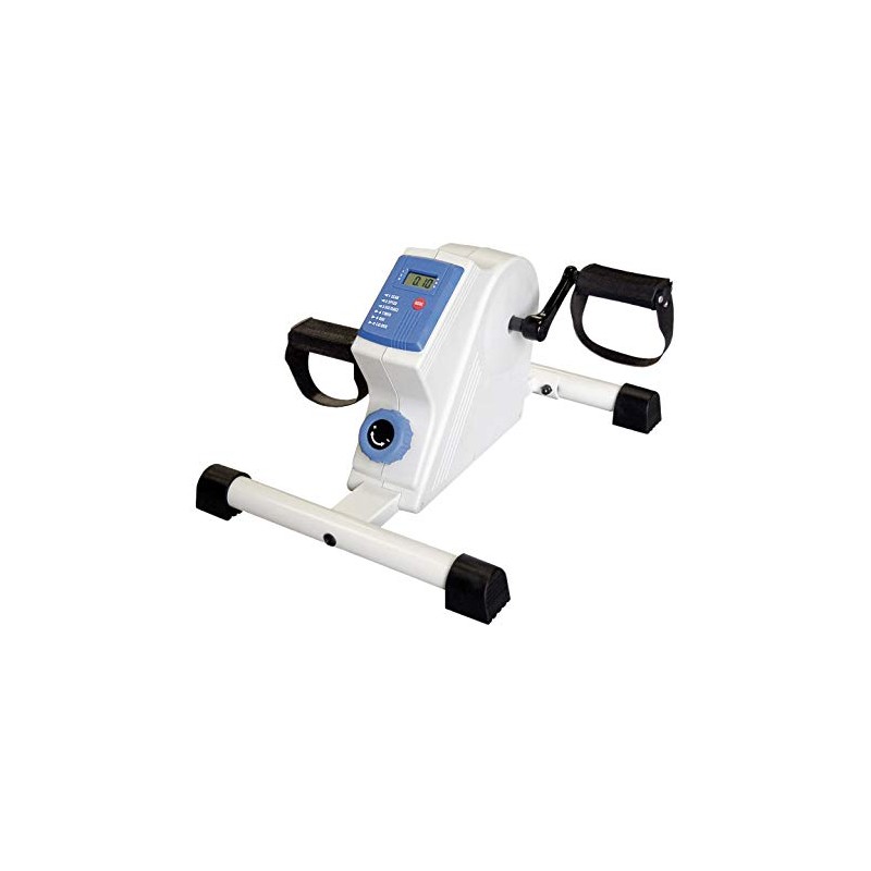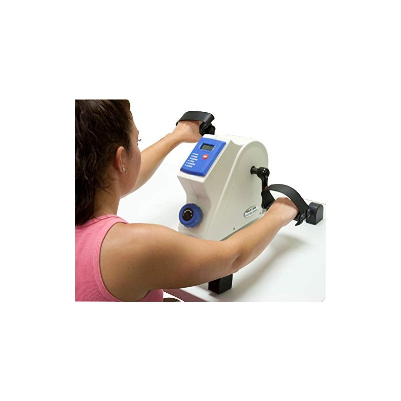 The CanDo deluxe digital pedal exerciser is an inexpensive and portable exerciser for both the upper and lower body. Digital LCD display keeps track of amount of exercise performed, including: Scan, Speed, Distance, Timer, Odometer and Calories burned. Requires 2 AA batteries (included). It can be used on the floor for foot pedaling, or on the tabletop for hand pedaling. Wide leg spread and non-marring feet keep exerciser stable even when patient has little muscle control. Wrap around adjustable foot straps for use with or without shoes. Adjustable tension nob allows for easy changes in pedaling difficulty level. Pedal forwards or backwards.