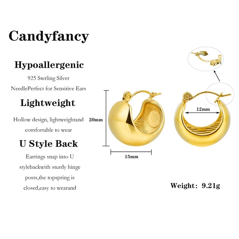 - Lightweight Hoop Earrings Size:Chunky gold hoop earrings, 12mm(0.47"),15mm(0.59"),21mm(0.8"), in diameter are available,fashionable for daily wear.
