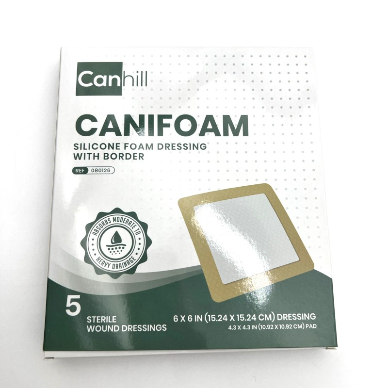 Canhill CANIFOAM, bordered foam dressing, silicone adhesive dressing, wound care dressing, 6x6 foam dressing, sterile medical bandage, square bordered dressing, exudate absorption pad, Canhill wound care supplies.