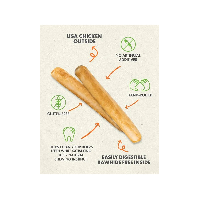 Hide Free Chicken Chews start with USA Sourced and Raised Chicken as the first ingredient and use ABSOLUTELY NO RAWHIDE OR COLLAGEN in production. Available in retriever rolls, knots, and sticks and in sizes from mini to extra-large we have the perfect sized chew for your dog.