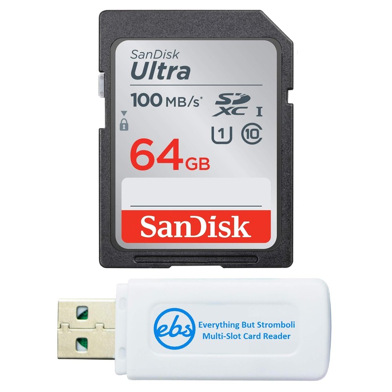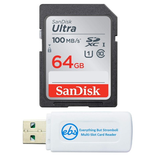 Canon EOS Rebel T5 Memory Card SanDisk SD Ultra SD Memory Card Bundle with Everything But Stromboli Memory Card Reader (64GB)