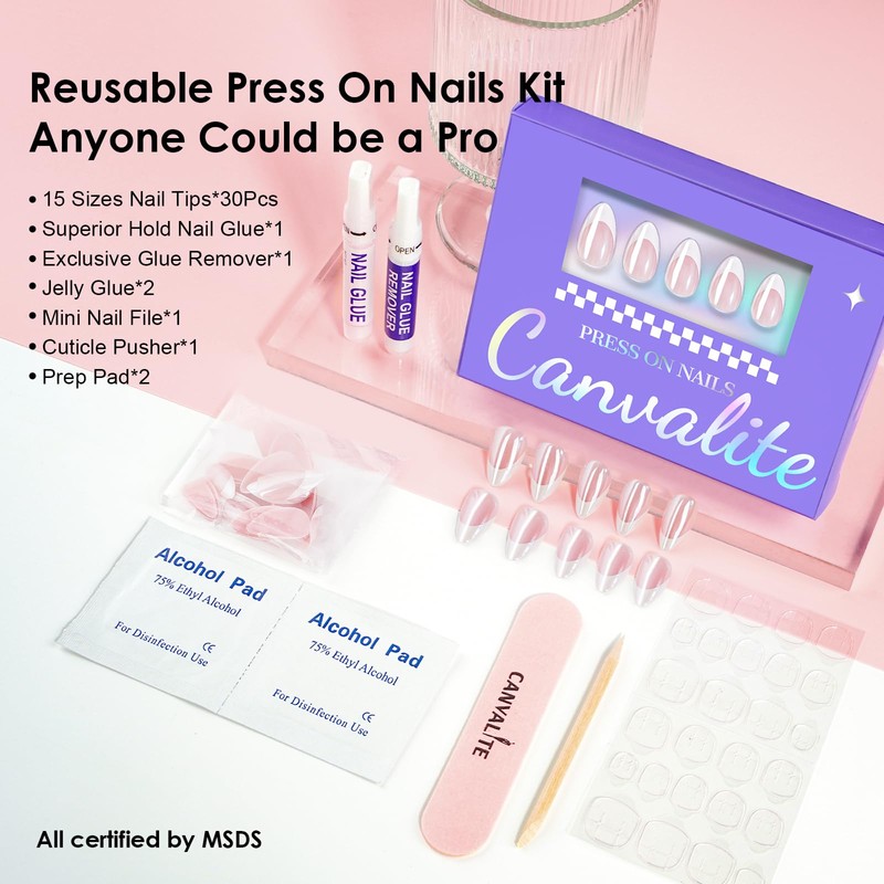 - Bang for Your Buck: Fake nails kit comes with everything you need, including 30 nails in 15 sizes, 1 nail glue, 1 glue remover, 2 jelly glues, 1 mini nail file, 1 cuticle pusher, and 2 pre pads. Embrace comfort and convenient manicure with our press on french tip nails.