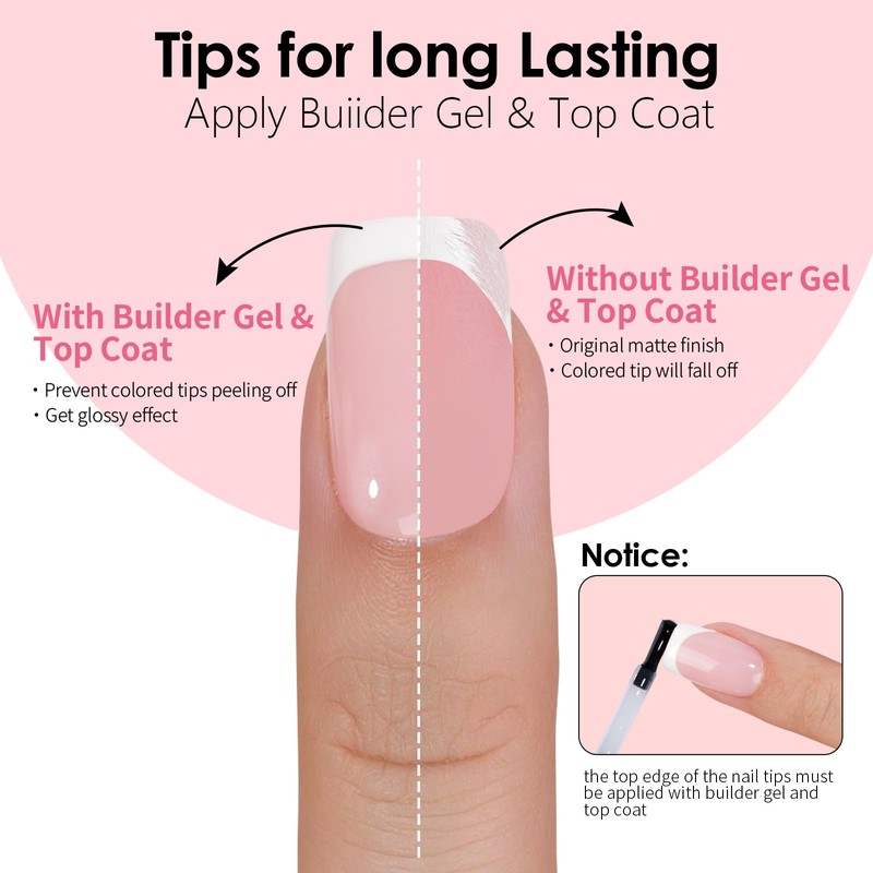 - Base French Nail Tips for DIY : Convenient base french nails tips come with matte finish, which can hold glue well if you like to add extra decos. If you want to get a glossy finish and keep the classic style just apply a top coat and done. This nail tips provide a cost-effective and convenient way to do manicures at home. Perfect for people who enjoy doing nails as a hobby or side business. NOTE: Glue not included You can use them with adhesive tabs for short-term wear or nail glue for longer-lasting