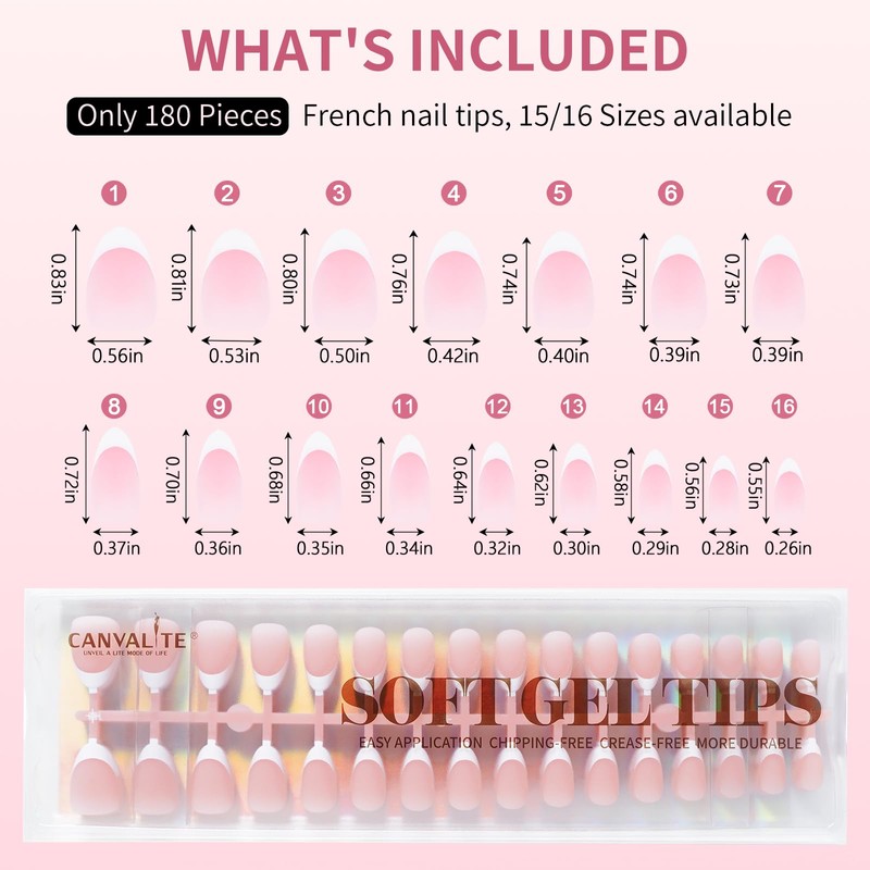 Canvalite Soft Gel French Tip Nails, 180 Pcs Almond Press on Nails for Women Flexible Pre-Painted White French Tip DIY Manicure Gifts for Women, Glue Not Included