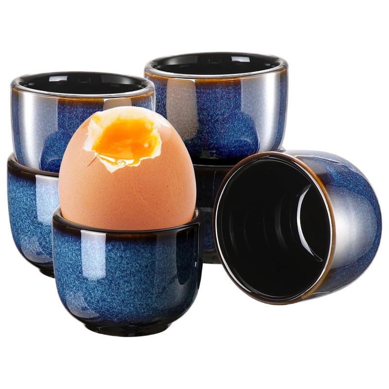 PRODUCT FEATURES The egg cups are made using a traditional firing process, giving each porcelain egg cup a unique blue-black gradient pattern. The subtle, understated blue color is complemented by dark to light shades, as deep as a cat's eye.