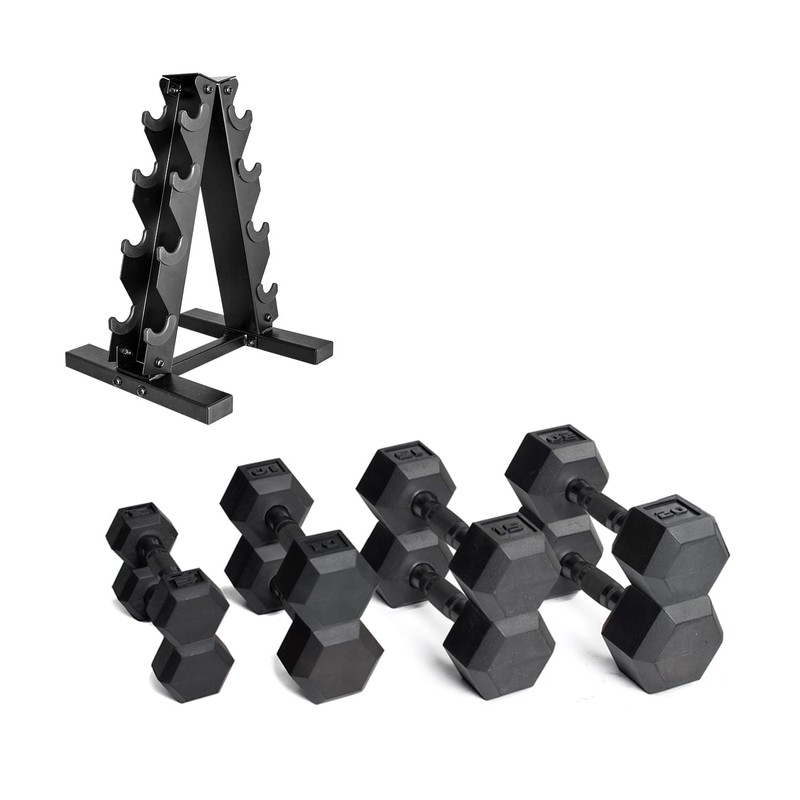 - SET INCLUDES – A pair of 5-pound, 10-pound, 15-pound and 20-pound rubber hex with blakc handle dumbbells with an A-frame dumbbell rack to store the weights. E-commerge packaging. This set ships in multiple boxes.