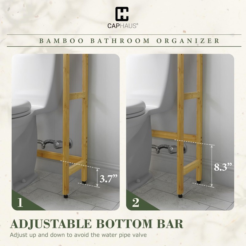 • 🎋 Spacious Storage Capacity - This bamboo storage rack is 31.1-Inch W x 9.25-Inch D x 65.75-Inch H, and the bamboo shelf is 20.67-Inch W & 8.27-Inch W. With the bottom basket 3.74 to 8.27-Inch from the floor, designed to fit most standard toilets, without worrying the toilet lid hitting the shelf. Overall Rack Weight Capacity: 220 lbs., ensuring robust support for a variety of items. The S-hooks added convenience for hanging tissues or brushes, adding practicality to the shelf's functionality.