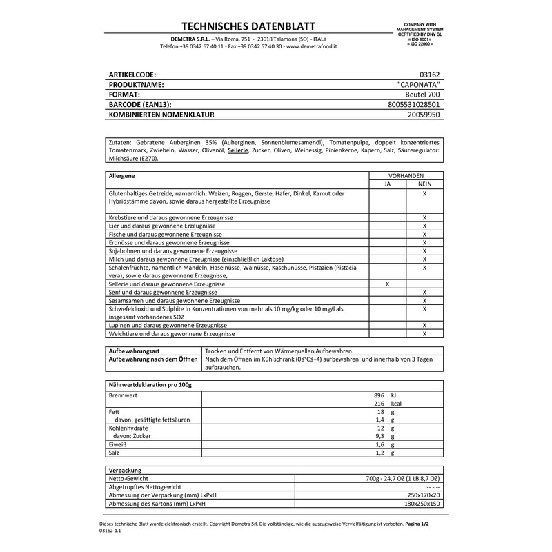 Ingredients: aubergines, tomato pulp, water, onions, olive oil, celery double tomato concentrate, sugar, olives, wine vinegar, capers, pine nuts, salt, antioxidant: ascorbic acid (E300).