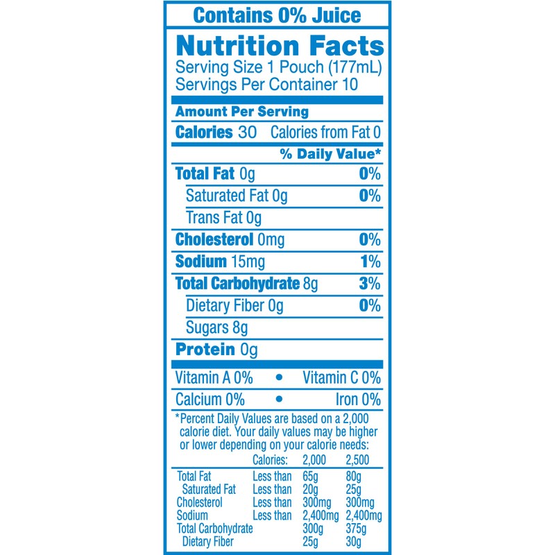 - Each drink pouch contains 50% less sugar than the average leading fruit juices (Per 6 fl. oz., this product 8 g total sugar, leading average fruit juices 20 g sugar)