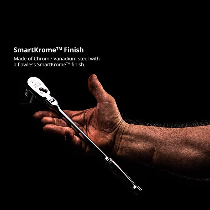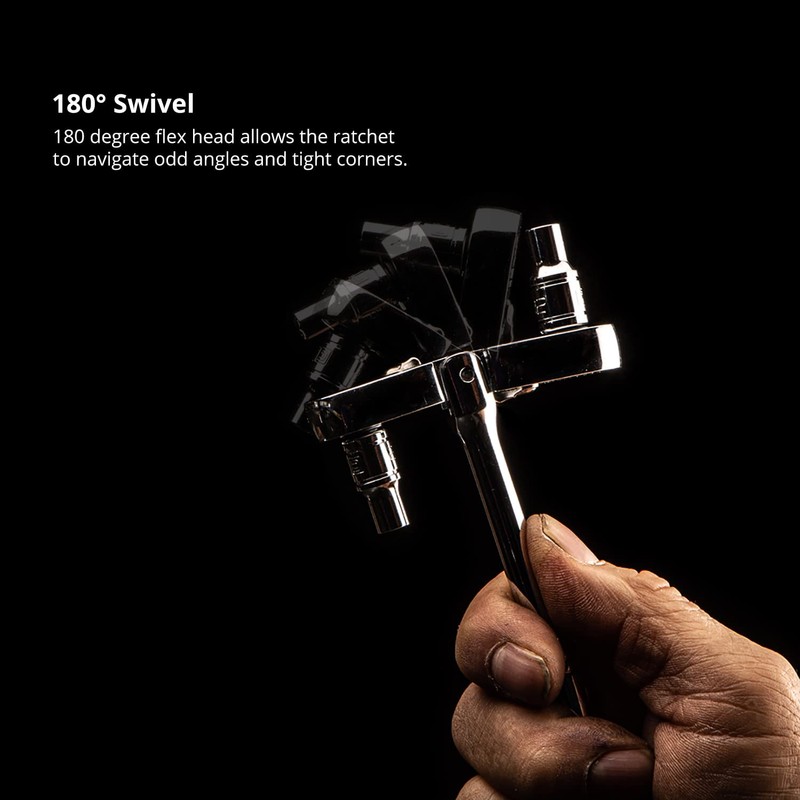 - 180-degree flex-head makes it easy to navigate odd angles and tight corners. Low profile ratchet head lets you work in tight spots with low clearance. Anti-dust design seals out dusts and debris, protects the gear, and maintains internal lubrication for sustained high performance over time