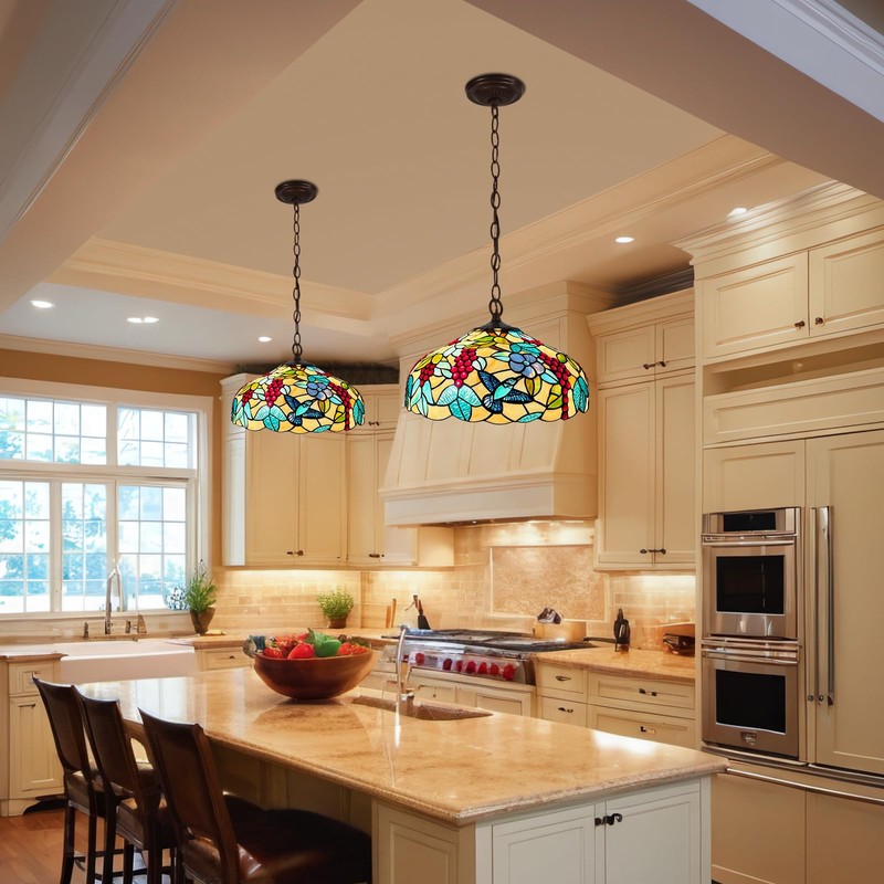 - Decor kitchen dining room: When you light bulb up,Tiffany lamp shade enhance kitchen island and make it come alive with color,Obtain very pleasant ambiance lighting