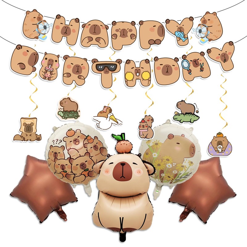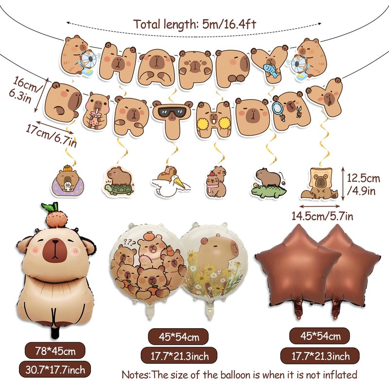 - Complete Party Set: This capybara party decoration includes 1 capybara “HAPPY BIRTHDAY” banner, 5 aluminium balloons, and 6 hanging swirls decorations – everything you need to transform your space for a fun-filled celebration.