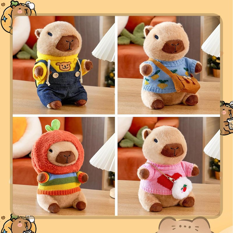 - Capybara plush toy set: contains 5 fashionable garments (rainbow jumper, hoodie, jumpsuit) and accessories (small bag, hat). If you have any questions about this product, please contact us in time and we will give you a satisfactory answer.