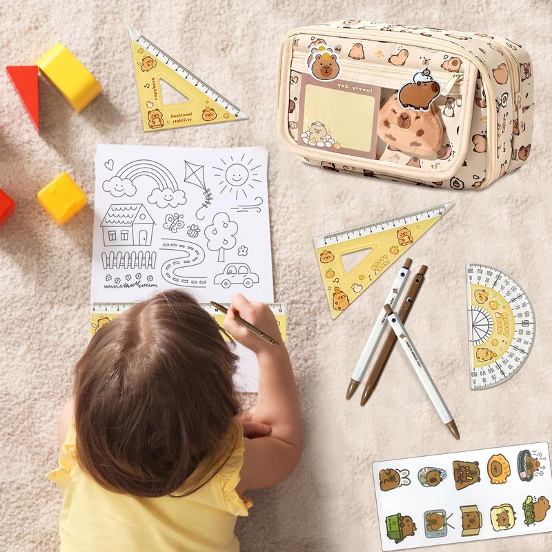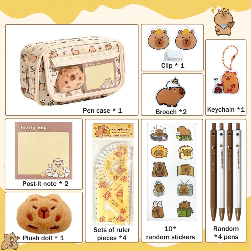 • RICH SET The Capybara stationery set includes a 9 layer capybara pencil case, 10 cute capybara stickers, 4 capybara pens (random colors), 4 capybara rulers, 50 capybara sticky notes, 1 capybara doll, 1 brooch, 1 clip and 1 pendant. The set is rich in content, enough to meet your daily needs