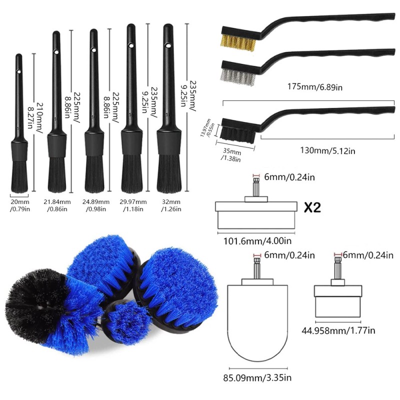 【5 x Car Detailing Brush & 3 x Wire Brushes 】5 Different Sizes Car Detailing Brushes can meet any cleaning needs of small cracks, corners, lug nuts, wheels, vents, car seats, engine compartments, dashboards, signs, etc. 3 pcs wire brushes including 1 stainless steel brush, 1 brass brush, and 1 nylon brush. Wire Brush of different materials is suitable for different surface types, they will address all your cleaning concerns.