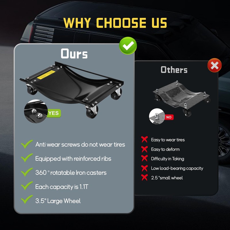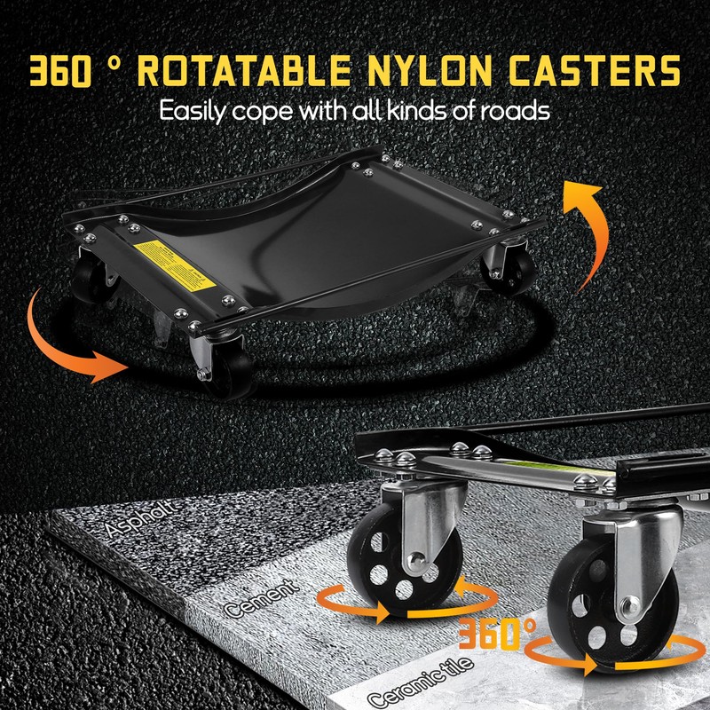 - Versatile Performance: This dolly is not only ideal for moving cars but also perfect for tire changes and diverse maintenance tasks. Its extra-wide design accommodates wide-profile tires, making it suitable for family cars, SUVs, ATVs, and more.