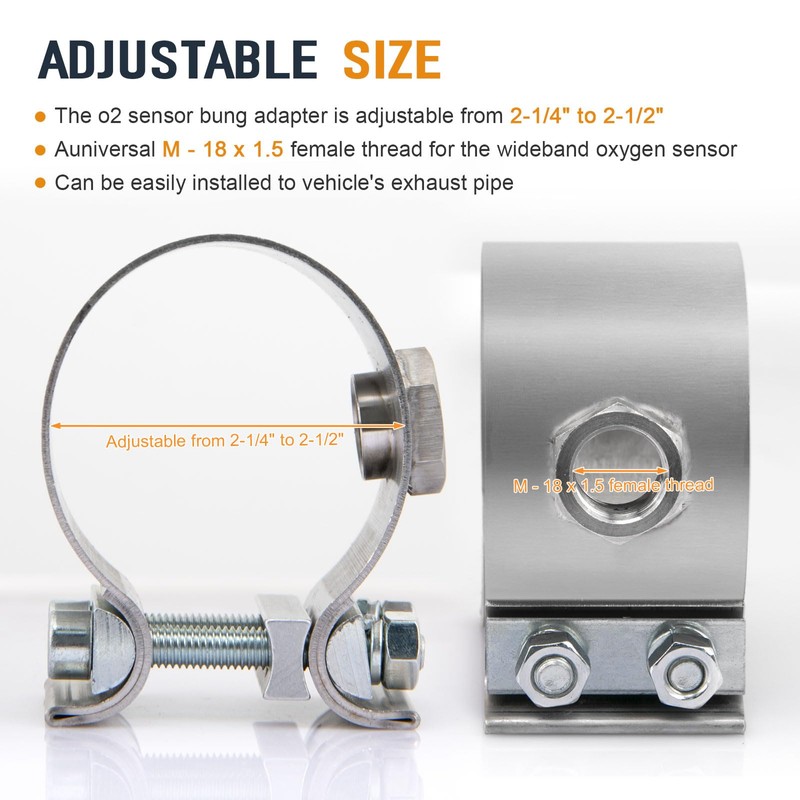 - 【Adjustable Size】The car o2 sensor bung adapter kit is adjustable from 2-1/4" to 2-1/2", can be easily installed to vehicle's exhaust pipe. The o2 sensor adapter also equipped with a universal 1.5 female thread for the wideband oxygen sensor.