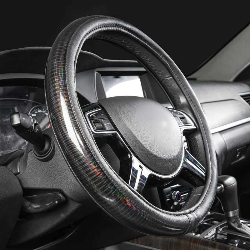 CAR Pass Car Steering Wheel Cover,Sporty Glossy Iridescent Reflective Leather Universal Fit Steering Wheel Covers,Fit for 14.5-15 inchs Car,Truck,SUV,sedans(Black)