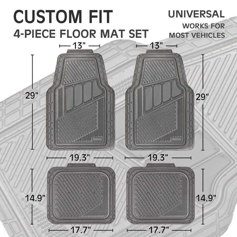 - All Weather Protection: This four piece set of all season rubber floor mats protect your truck's floors from dirt and debris; this car mats design holds water, snow, mud, and road salt