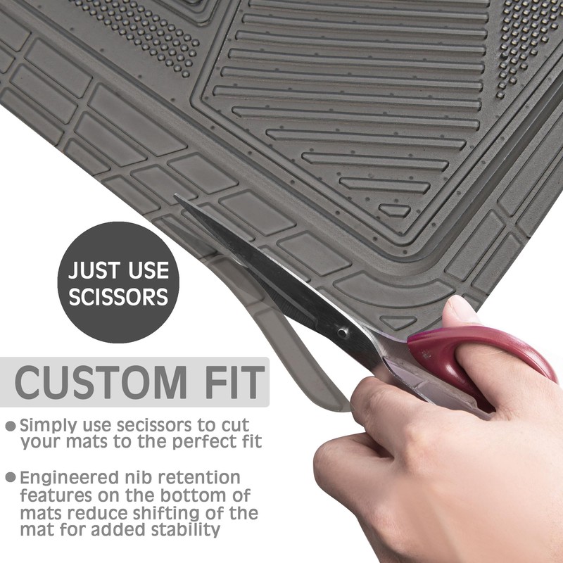 - Custom Fit Design: Created for fast and easy installation in most cars, trucks and SUVs, these universal floor mats can be trimmed with a pair of scissors to provide the perfect custom fit for your vehicle
