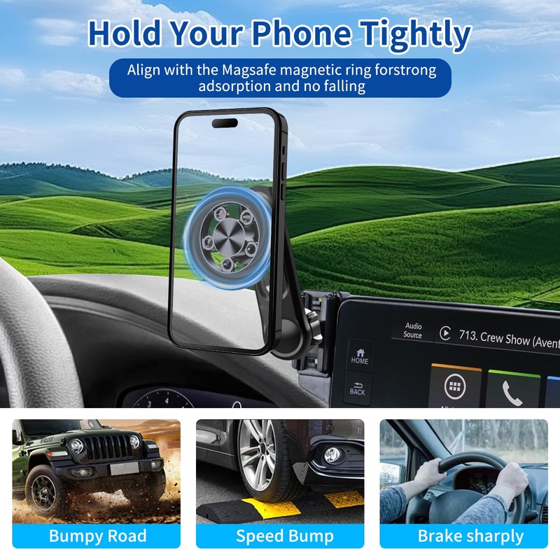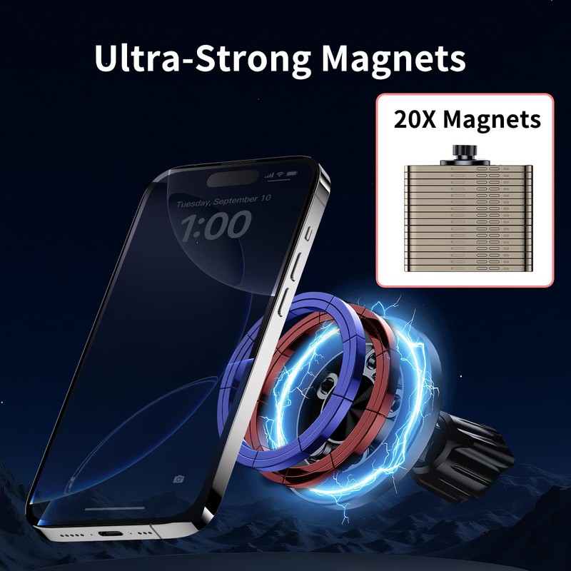 - 【Strong magnetic Car Mount】 This powerful magnetic phone holder for built-in 20 upgraded N55 super magnets. It easily and securely holds your phone through bumps, sharp turns or even sudden stops, no worrying of dropping your phone