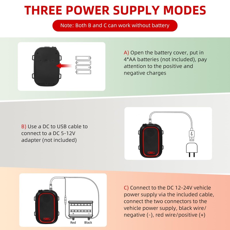 - Multiple Power Supply Options: Choose from three power supply methods: connect to 12-24V vehicle power, a 5-12V USB adapter, or install 4 AA batteries (not included). Convenient for various setups and locations