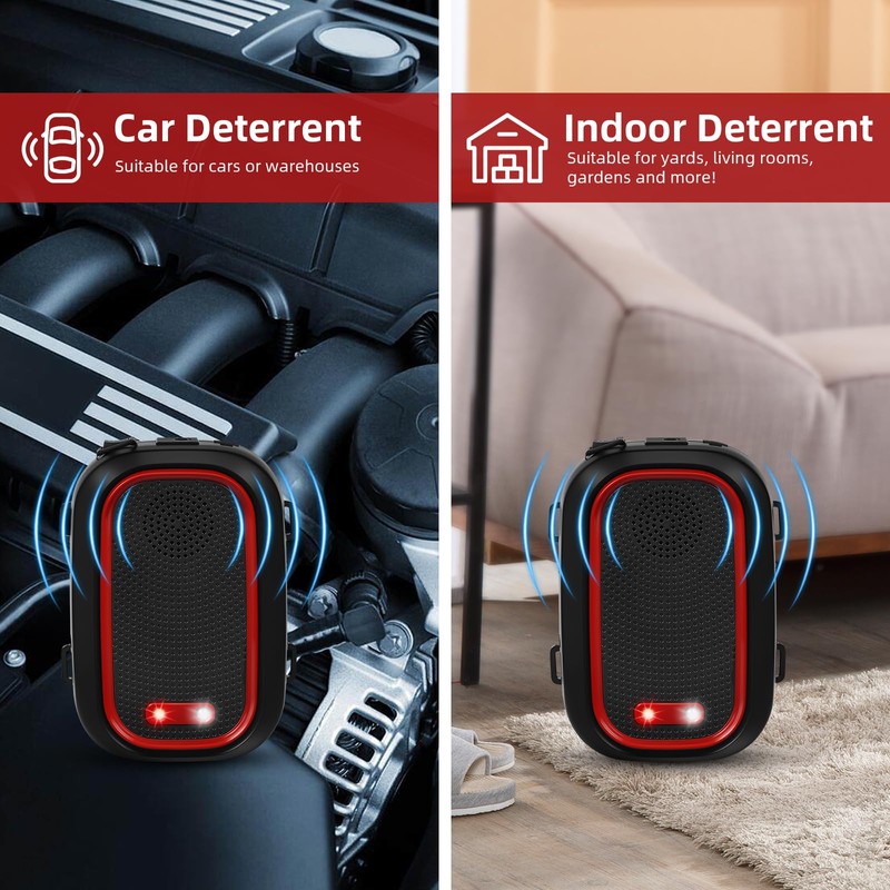 - Protect Your Vehicle from Rodents: Drive away mice, squirrels, and other pests from your car’s engine and interior. An ultrasonic rodent repeller can cover up to 430 sq. ft., protecting your vehicle, garage, attic, or barn