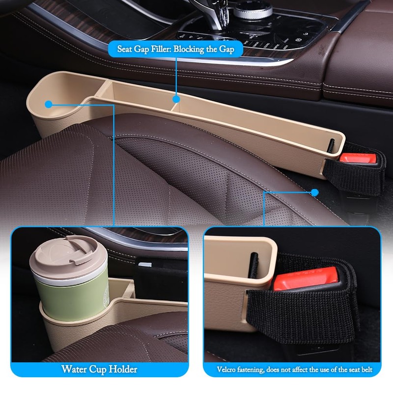 Car Seat Gap Filler, Multifunctional Seat Side Gap Filler with Cup Holder & Organizer, Gap Stopper Universal Fit Car SUV Truck Fill The Gap Between Seat & Console Set of 2 (Beige)