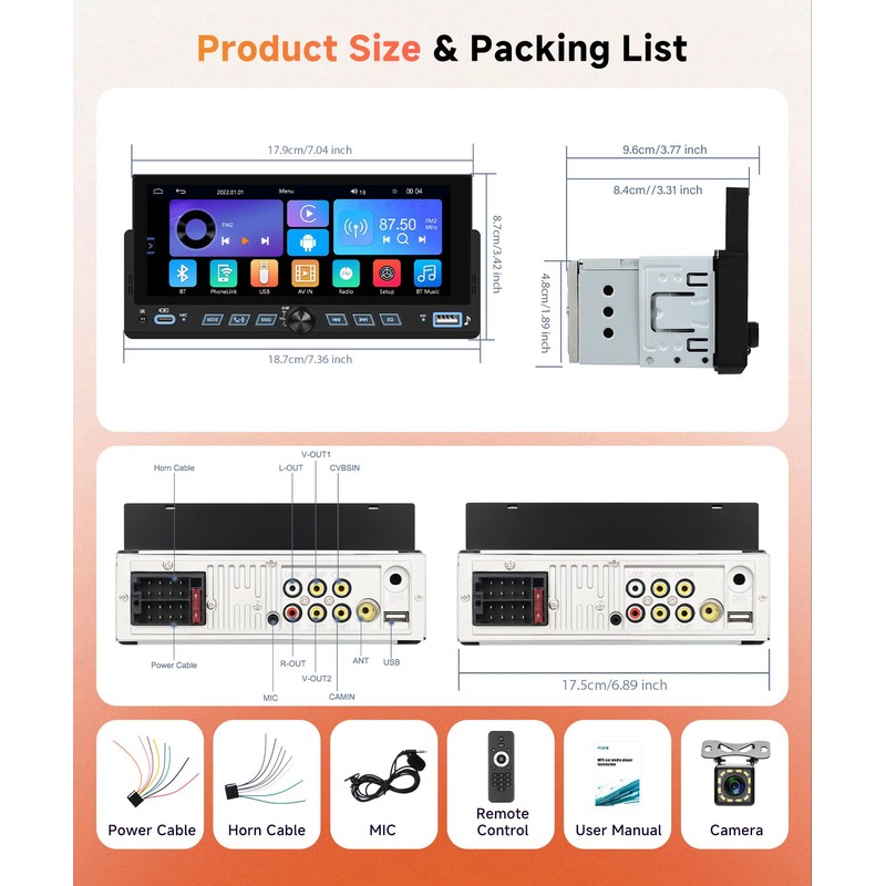 - Rear View Camera Input: 1 DIN touch screen Car stereo with backup camera, with easy operation rear-view camera, when the vehicle shifts into reverse,the car radio screen will automatically display the reverse image, when parking finishes, it will return to radio page