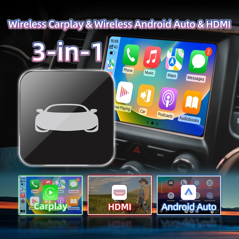 - Tri-Channel Smart Switch: Seamlessly Toggle HDMI Streaming & CarPlay & Android Auto Without Compromise Enjoy uninterrupted entertainment and navigation: Instantly switch between streaming (Video/gaming) and CarPlay/Android Auto via one-touch control. CarPlay stays active in background for calls/maps, while HDMI delivers crisp 60Hz visuals.