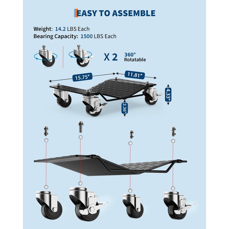 - 【6000LBS Load-Bearing Capacity 】- Each car wheel dolly can easily handle up to 1500 LBS (6000 LBS in total), making it effortless to move vehicles with medium to heavy wheels, such as SUVs and Trucks.Keep the whole car balance and stable.